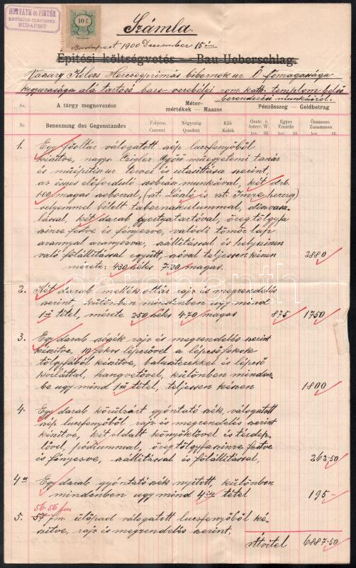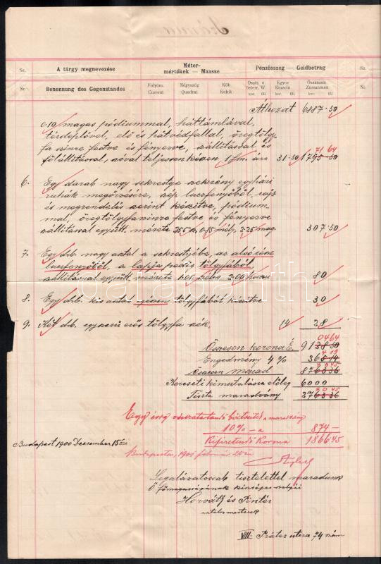 Beschreibung: 1900 bars-verebélyi róm. kath templom belső asztalos munkáinak költségvetése. Horváth és Pintér asztalos mesterektől
