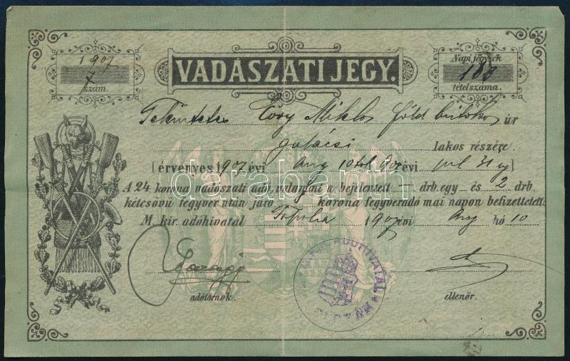 1907 Tapolca, vadászati jegy Eőry Miklós gulácsi földbirtokos részére,... https://www.darabanth.com/de/477-Fernauktion/477.0/Kunst-Dokumente-andere-Sammelgebiete/Dokument~1000023/1907-Tapolca-vadaszati-jegy-Eory-Miklos-gulacsi-foldbirtokos-reszere-hajtasnyommal-pecse~II3252815