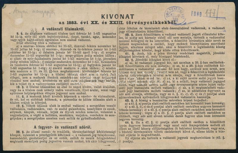 Beschreibung: 1907 Tapolca, vadászati jegy Eőry Miklós gulácsi földbirtokos részére, hajtásnyommal, pecséttel.