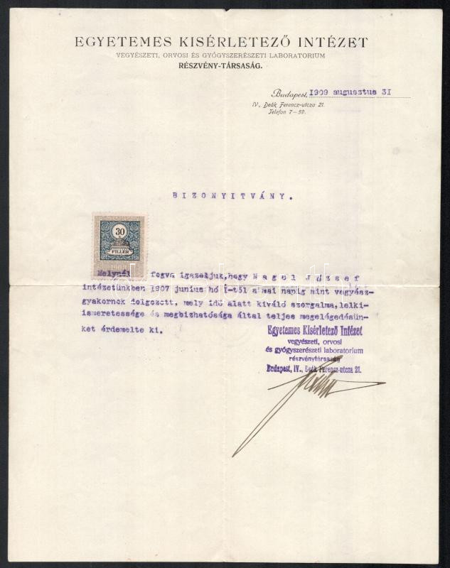 Beschreibung: 1909 Bp., Egyetemes Kísérletező Intézet orvosi és gyógyszerészeti laboratórium rt. fejléces papírjára írt bizonyítvány