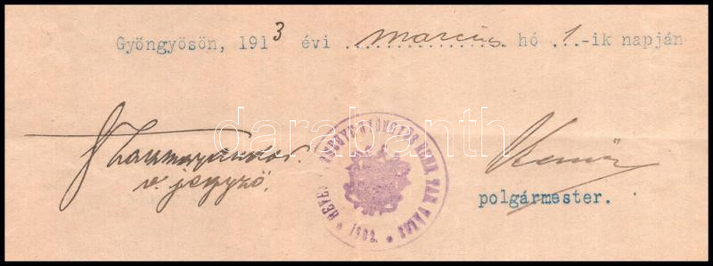 1913 Gyöngyös, erkölcsi bizonyítvány Kemény János (1855-1935) polgármester aláírásával, fejléces papíron, bélyegzővel, 1 Korona okmánybélyeggel, apró szakadásokkal
