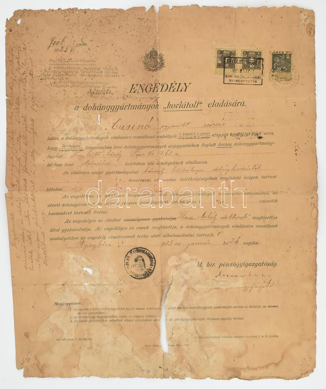 1923 Korlátoozott dohányárusítási engedély. Nyíregyháza. Hajtva 36x42 ... https://www.darabanth.com/de/477-Fernauktion/477.0/Kunst-Dokumente-andere-Sammelgebiete/Dokument~1000023/1923-Korlatoozott-dohanyarusitasi-engedely-Nyiregyhaza-Hajtva-36x42-cm~II3205211