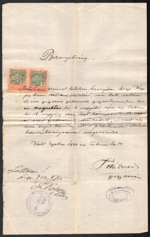 Beschreibung: 1924 Egyek, gyógyszerész által kiállított bizonyítvány gyógyszertári pecséttel, okmánybélyegekkel
