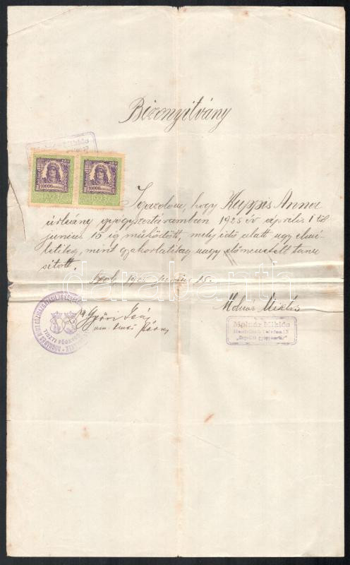 1925 Szob, bizonyítvány gyógyszertári pecséttel, illetékbélyegekkel https://www.darabanth.com/de/477-Fernauktion/477.0/Kunst-Dokumente-andere-Sammelgebiete/Dokument~1000023/1925-Szob-bizonyitvany-gyogyszertari-pecsettel-illetekbelyegekkel~II3253061
