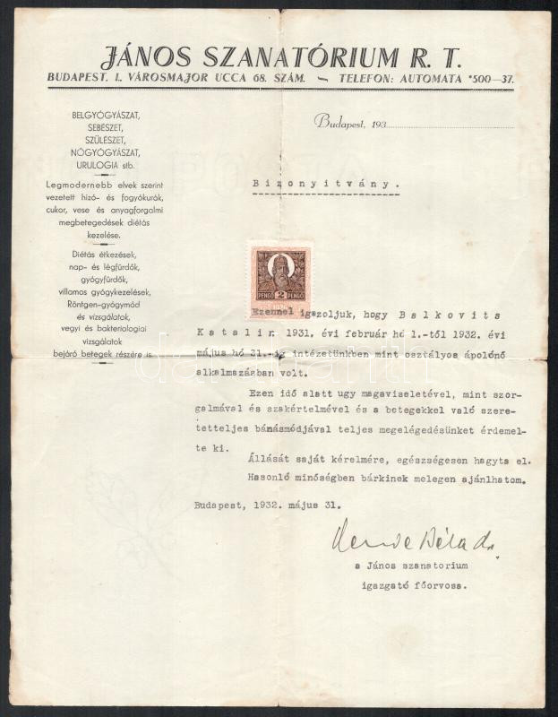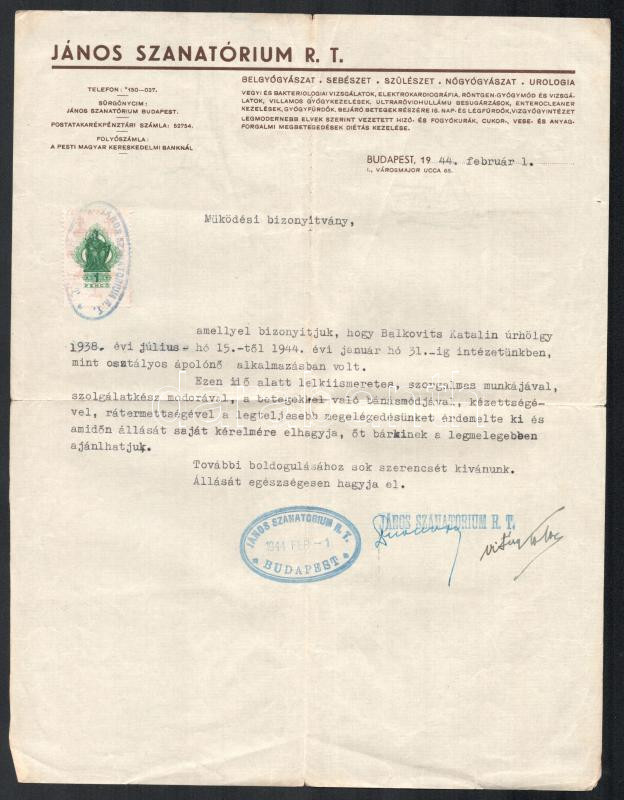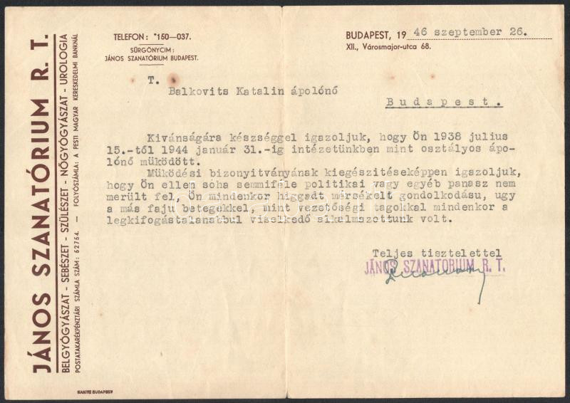 1932-1946 Bp., János Szanatórium össz. 3 db bizonyítványa ugyanazon ápoló részére beazonosítandó aláírásokkal, fejléces papíron, kettőn bélyegzővel és okmánybélyeggel, 1946-os egyben politikai igazolás