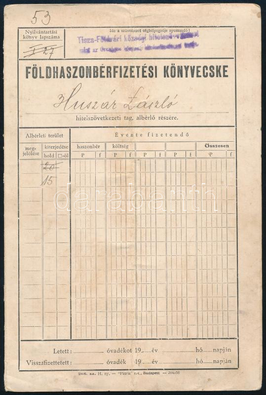 1932 Tiszaföldvár, földhaszonbérfizetési könyvecske https://www.darabanth.com/de/477-Fernauktion/477.0/Kunst-Dokumente-andere-Sammelgebiete/Dokument~1000023/1932-Tiszafoldvar-foldhaszonberfizetesi-konyvecske~II3251994