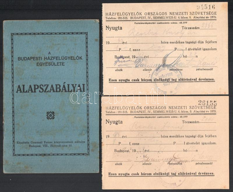 Beschreibung: 1935-1943 A Budapesti Házfelügyelők Egyesülete alapszabályai, egyben tagsági igazolvány + Házfelügyelők Országos Nemzeti Szövetsége által kiállított 2 db nyugta