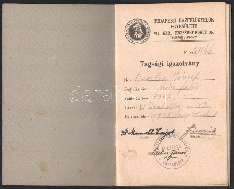 1935-1943 A Budapesti Házfelügyelők Egyesülete alapszabályai, egyben t... https://www.darabanth.com/de/477-Fernauktion/477.0/Kunst-Dokumente-andere-Sammelgebiete/Dokument~1000023/1935-1943-A-Budapesti-Hazfelugyelok-Egyesulete-alapszabalyai-egyben-tagsagi-igazolvany-plus-Ha~II3251165