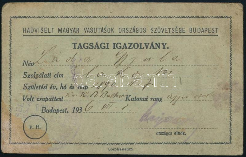 1936 Bp., Hadviselt Magyar Vasutasok Országos Szövetsége tagsági igazo... https://www.darabanth.com/de/477-Fernauktion/477.0/Kunst-Dokumente-andere-Sammelgebiete/Dokument~1000023/1936-Bp-Hadviselt-Magyar-Vasutasok-Orszagos-Szovetsege-tagsagi-igazolvany-kisse-koszos-fol~II3209640
