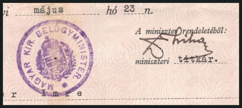 1938 Bp., belügyminisztériumi okirat névváltoztatási kérelem jóváhagyá... https://www.darabanth.com/de/477-Fernauktion/477.0/Kunst-Dokumente-andere-Sammelgebiete/Dokument~1000023/1938-Bp-belugyminiszteriumi-okirat-nevvaltoztatasi-kerelem-jovahagyasarol-miniszteri-t~II3243981