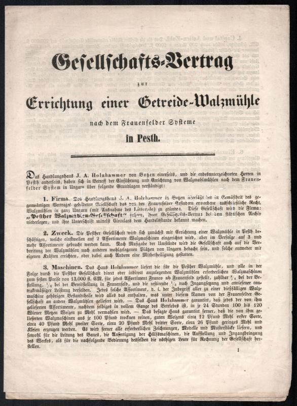 1839 Gesellschafts-Vertrag zur Errichtung einer Getreide-Walzmühle nach dem Frauenfelder Systeme in Pesth. / Pest, társasági szerződés hengermalom létesítésére, német nyelven, 8 p.