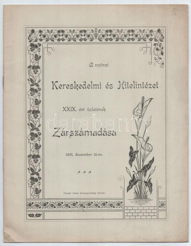 1902 A Nyitrai Kereskedelmi és Hitelintézet XXIX. évi üzletének zárszámadása 1901. deczember 31-én. Nyitra, Huszár István-ny., 12 p. Kiadói tűzött papírkötés, a hátsó borítón kis sérüléssel, a lapok egy részén hajtásnyommal.