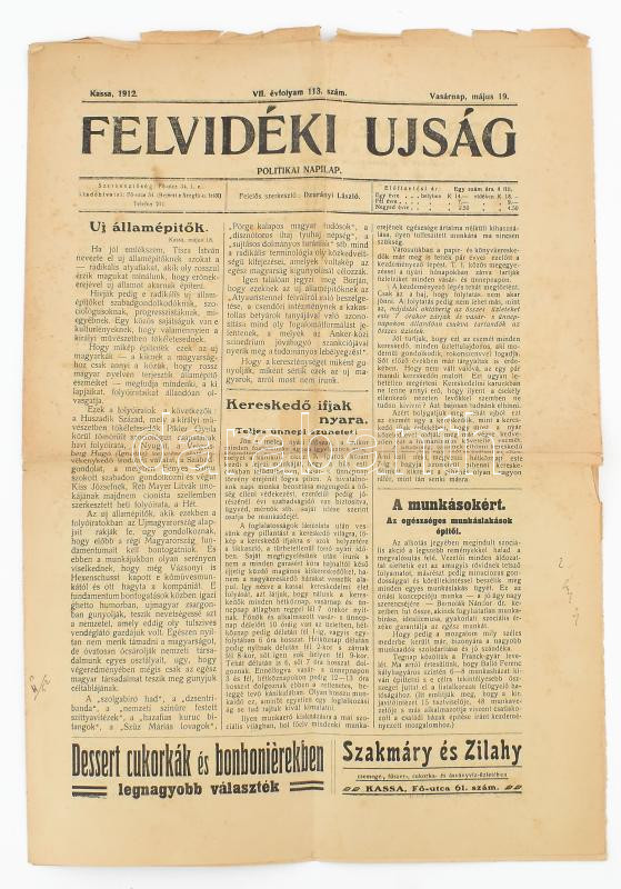 1912 A Felvidéki Ujság c. politikai napilap VII. évf. 113. száma https://www.darabanth.com/de/477-Fernauktion/477.0/Kunst-Dokumente-andere-Sammelgebiete/Drucksachen~2000013/1912-A-Felvideki-Ujsag-c-politikai-napilap-VII-evf-113-szama~II3246580