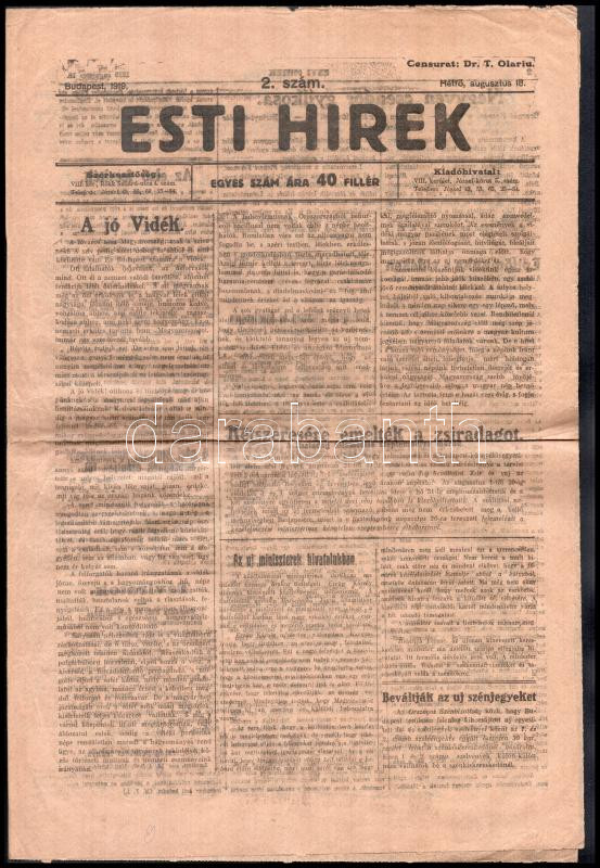 1919 augusztus 18. Az Esti Hírek c. újság 2. száma román cenzúrával https://www.darabanth.com/de/477-Fernauktion/477.0/Kunst-Dokumente-andere-Sammelgebiete/Drucksachen~2000013/1919-augusztus-18-Az-Esti-Hirek-c-ujsag-2-szama-roman-cenzuraval~II3245784