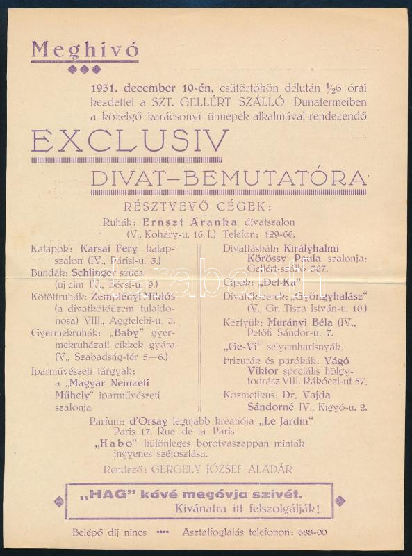 Beschreibung: 1931 Bp., Meghívó a Gellért Szállóba exkluzív divatbemutatóra, 14 különböző divatcég részvételével, HAG kávé reklámjával