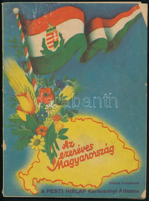1938 Az ezeréves Magyarország. Képes Vasárnap - A Pesti Hírlap karácsonyi albuma. Benne számos érdekes írással (Herczeg Ferenc: Utazás Nagy-Magyarországba; Márai Sándor: Egy nap emléke; stb.), fekete-fehér képekkel, hirdetésekkel. Kiadói tűzött papírkötés, sérült, a tűzéstől különvált borítóval, 100 p.