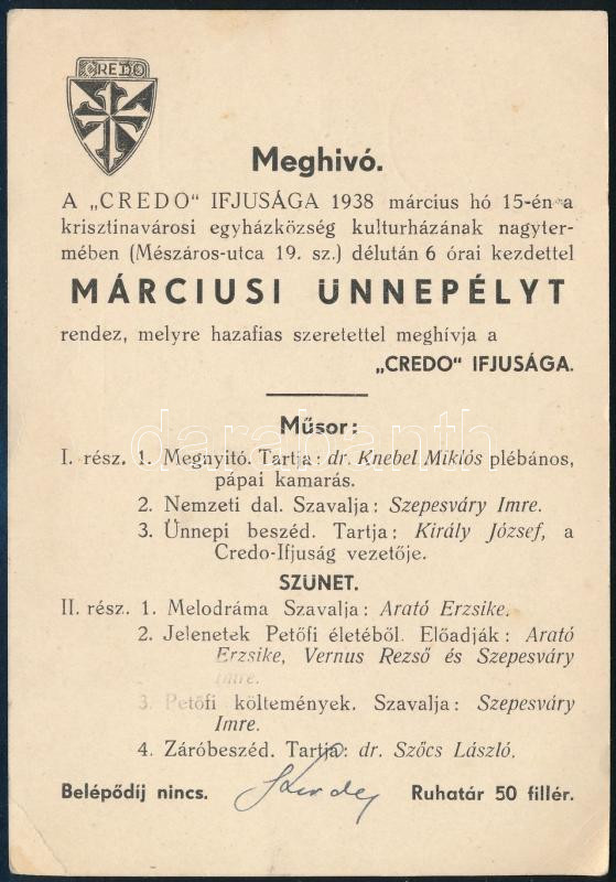 1938 Meghívó a Credo Ifjúságának márciusi ünnepélyére https://www.darabanth.com/de/477-Fernauktion/477.0/Kunst-Dokumente-andere-Sammelgebiete/Drucksachen~2000013/1938-Meghivo-a-Credo-Ifjusaganak-marciusi-unnepelyere~II3252056