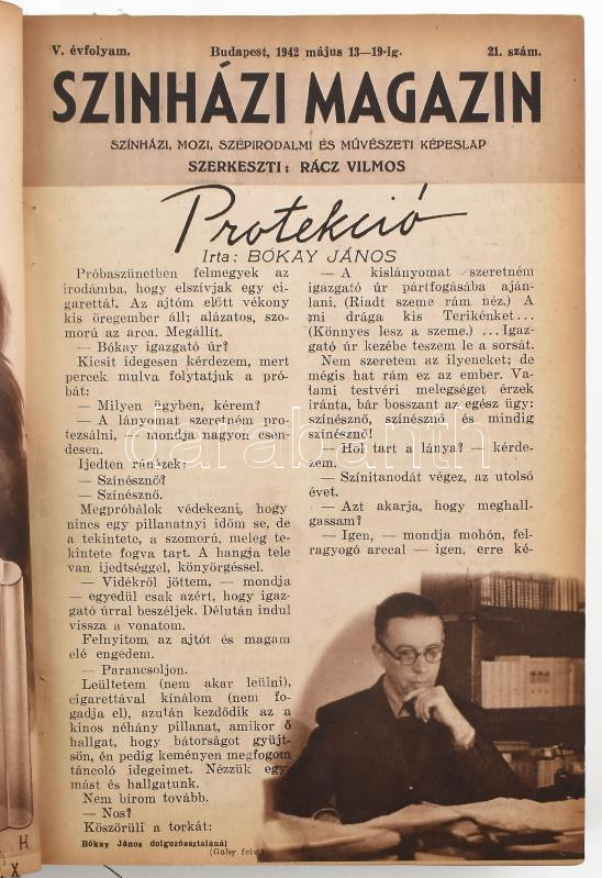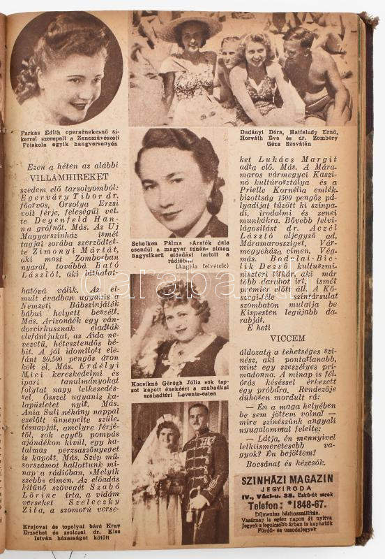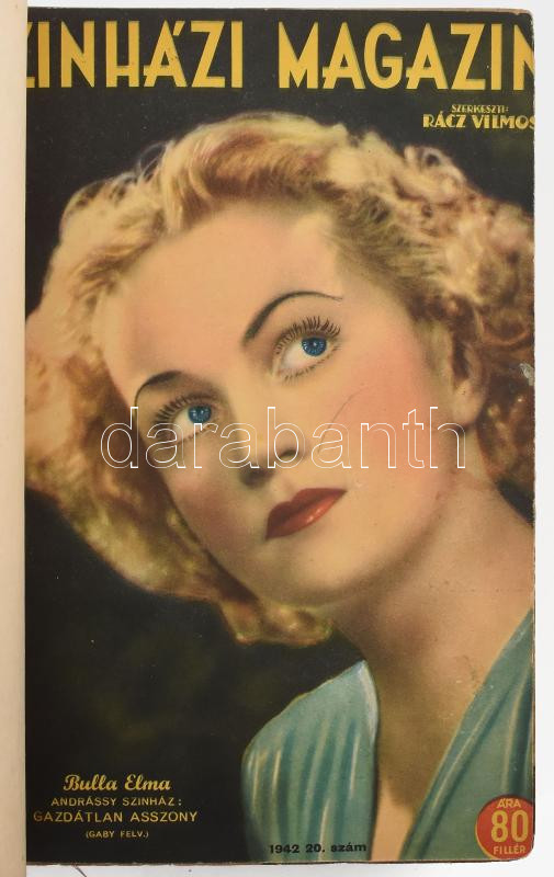 1942 A Színházi Magazin 20-35. száma vegyes állapotban, néhány laphiánnyal, pár szakadással, a hátsó borítókat nem kötötték bele, a címlapokon Bulla Elma, Kosáry Emmi, Tolany Klári, Lázár Mária, Lil Dagover, Karády Katalin, Dayka Margit, Zilahy Irén, Otrubay Melinda, Simor Erzsi, stb.