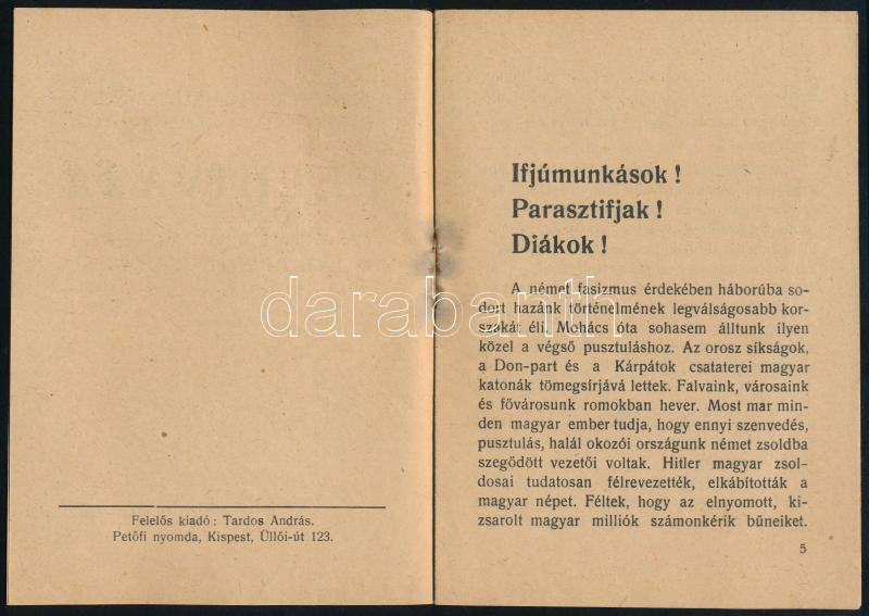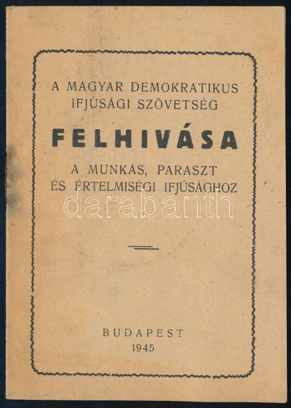 1945 A Magyar Demokratikus Ifjúsági Szövetség felhívása a munkás, paraszt értelmiségi ifjúsághoz. Bp., 1945., (Kispest, Petőfi-ny.), 13 p. Kiadói papírkötés, foltos, 14x10 cm.