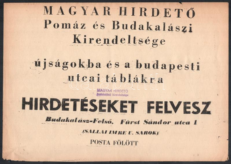 Beschreibung: "Magyar Hirdető Pomáz és budakalászi kirendeltsége hirdetéseket felvesz" hirdetmény, 20×29 cm