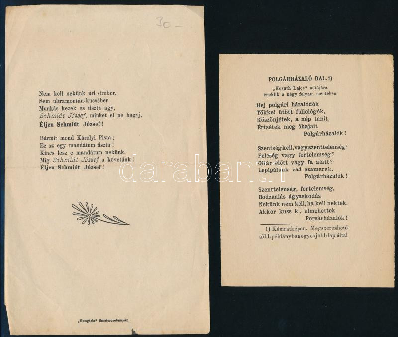 Beschreibung: cca 1900 Besztercebánya 2 db politikai kortesvers röplap, gyűrött
