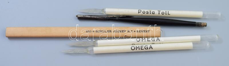 Beschreibung: 5 darab régi íróeszköz, közte 3 darab üveg Omega posta toll