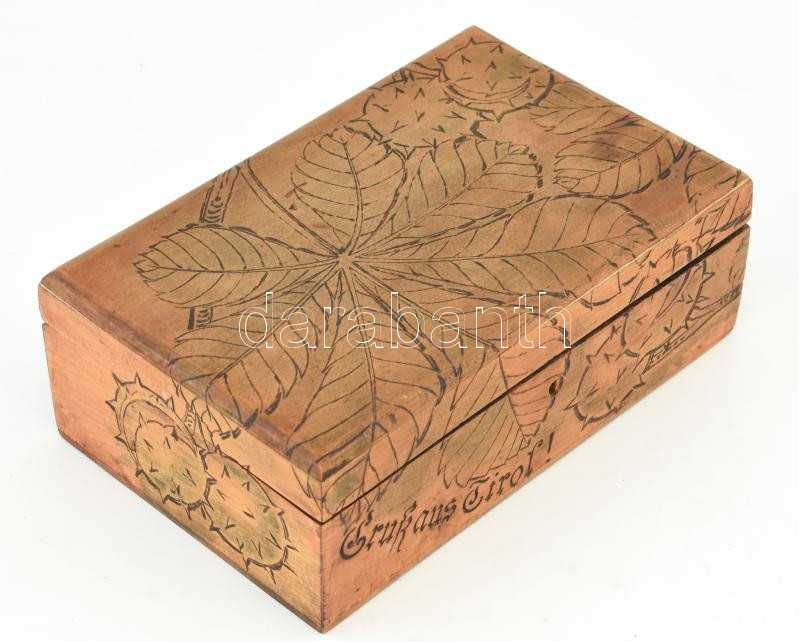 Bogáncsmintával égetett Tiroli fadoboz, kulccsal, működő zárral, kis s... https://www.darabanth.com/de/477-Fernauktion/477.0/Kunst-Dokumente-andere-Sammelgebiete/Flohmarkt~1000017/Bogancsmintaval-egetett-Tiroli-fadoboz-kulccsal-mukodo-zarral-kis-serulessel-22x14x8-c~II3206702