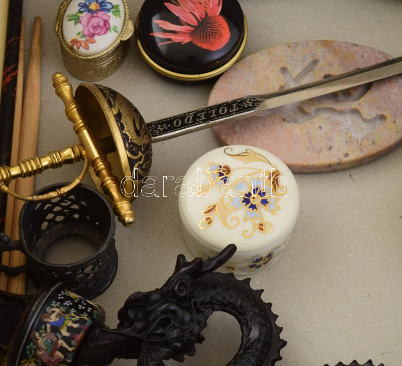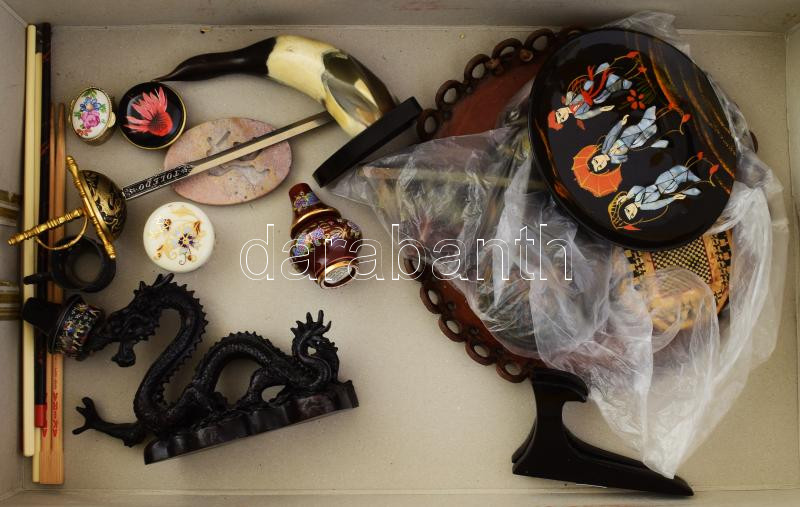 Beschreibung: Minőségi bolha tétel, közte Zsolnay búzavirág mintás edényke, gyöngyház berakásos japán tálkép, toledo levélbontó tőr, ló bőrkép, intarziás púderes doboz, stb.
