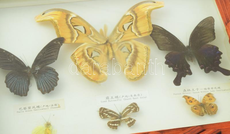 Beschreibung: Preparált lepkék, óriáslepke és skorpió, üvegezett tartókban