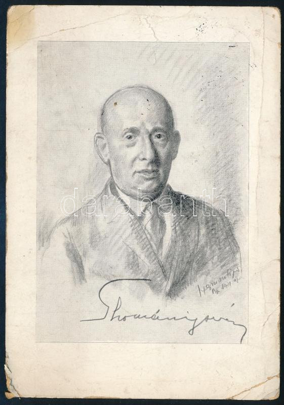 1932 Thomán István (1862-1940) neves zongoraművész (Erkel Ferenc tanítványa) autográf sorai és aláírása Seiberné Patay Berta zongoraművésznő, zenetanárnő (Keresztury Dezső anyósa) részére, Herman Lipót Thomán Istvánról készült portréjával illusztrált képeslapon, sarkaiban kissé sérült