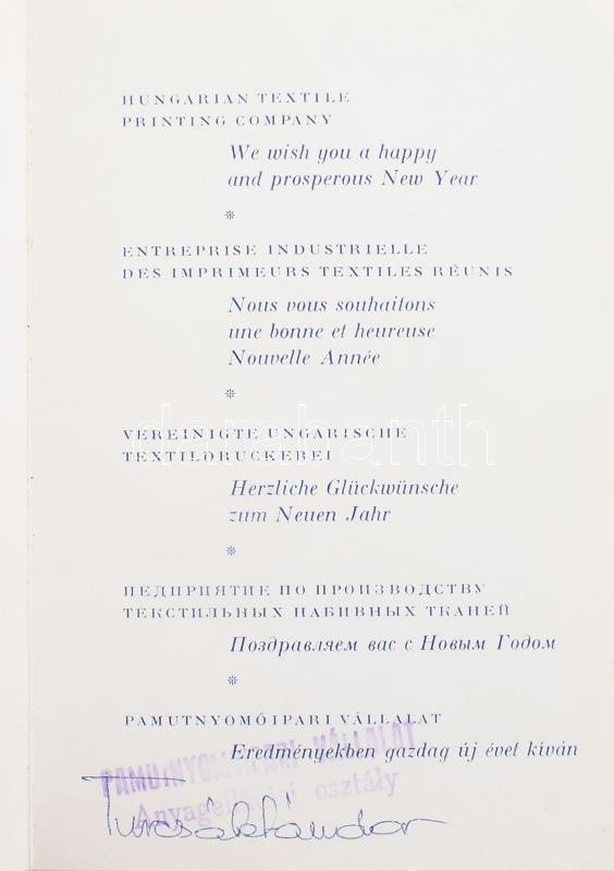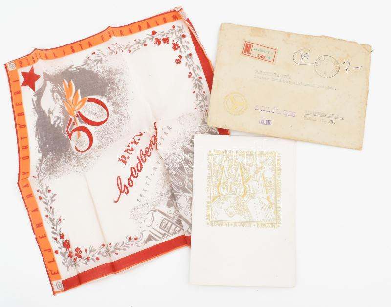 1967 Budaprint Pamutnyomóipari Vállalat újévi üdvözlőlapja, Turcsák Sándor aláírással + P.NY.V. Goldberger Textilnyomógyár - Októberi szocialista forradalom 50. évforduló emlékkendő, 25x22,5 cm. Eredeti, sérült borítékkal.