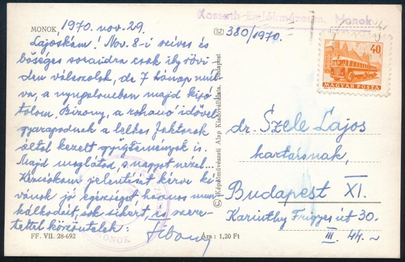 Beschreibung: 1970 Zsuffa Tibor a monoki Kossuth Emlékmúzeum vezetőjének autográf képeslapja