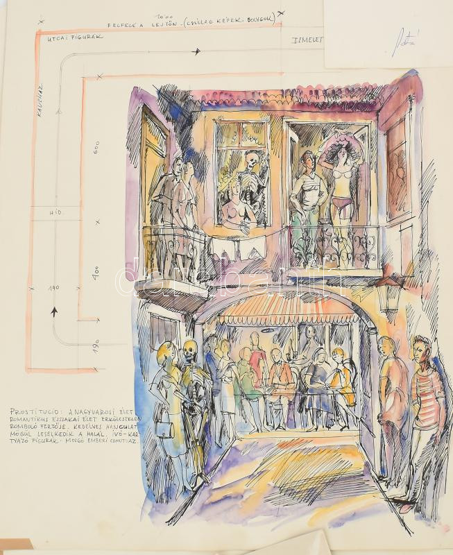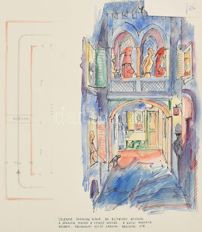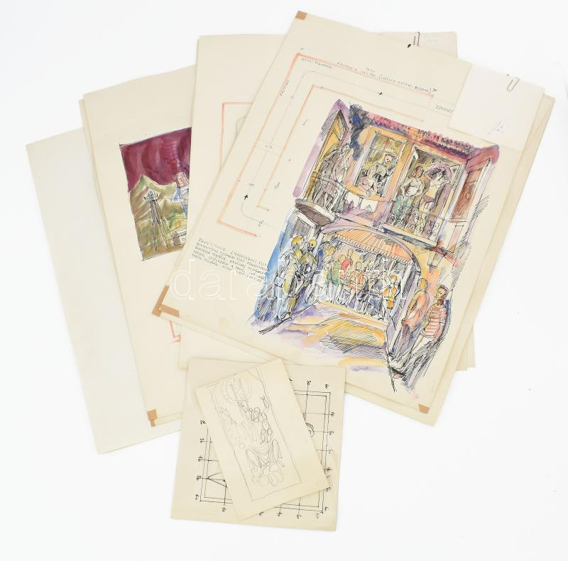 cca 1960 Varga Mátyás (1910-2002) grafikus, díszlettervező által készített színpadi látványtervek, össz. 14 db. Klf. technikák, papír, egyik jelzett. Klf. méretekben.