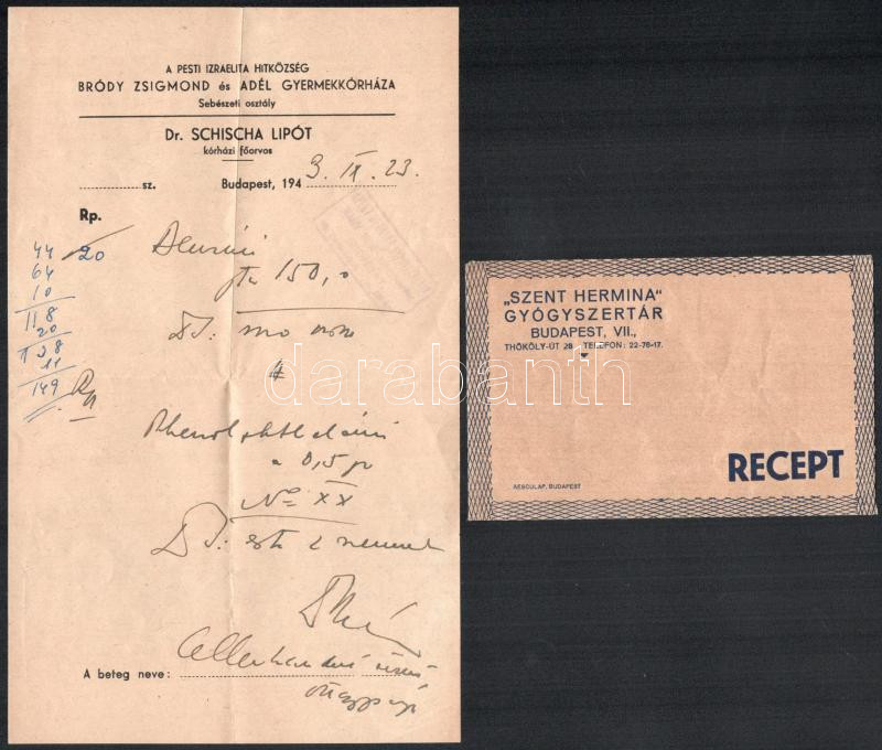 1943 A pesti Izraelita Hitközség Bródy Zsigmond és Adél Gyermekkórháza kitöltött receptje pecsételve, a Szent Hermina Gyógyszertár (Bp. Thököly út) receptborítékjával, szép állapotban