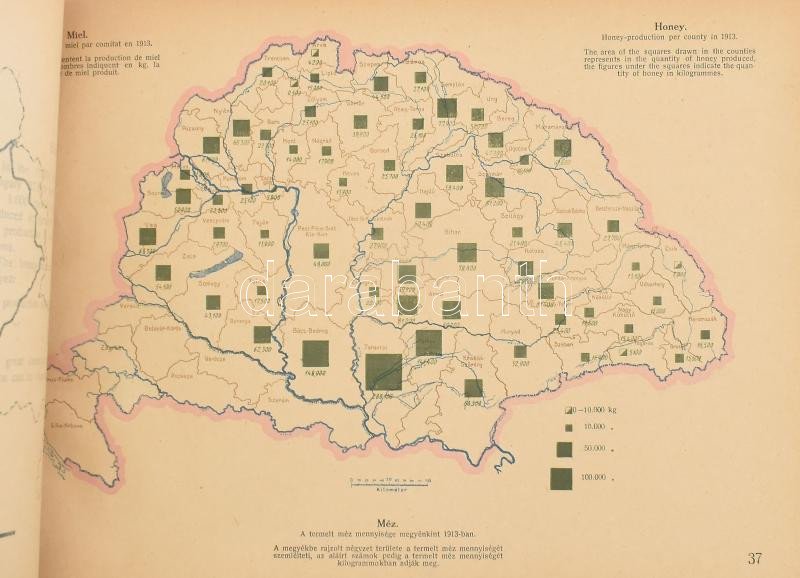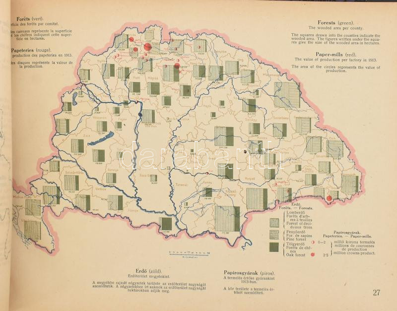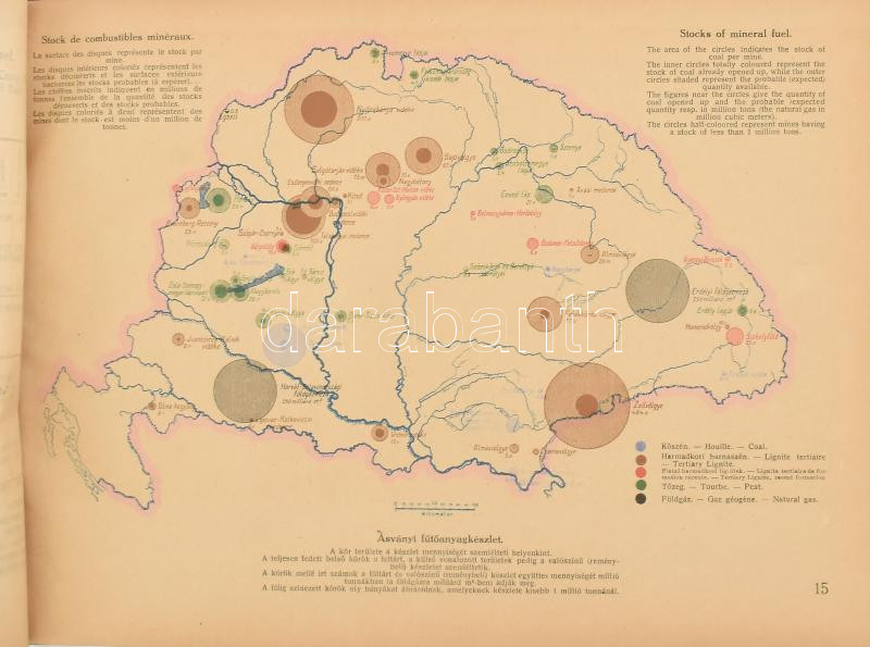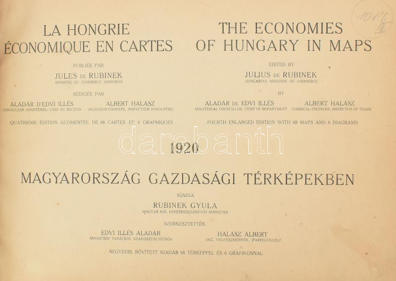 1920 Magyarország gazdasági térképekben. The economies of Hungary in maps. Gróf Teleki Pál béketárgyalást előkészítő iroda vezetője megbizásából szerk.: Edvi Illés Aladár és Halász Albert. Kiadja: Rubinek Gyula. Bp., 1920, Pallas, VII+1 p.+73+1 t. Negyedik, bővített kiadás. Átkötött haránt-alakú félvászon-kötés, kopott borítóval, (körbevágott?), 20x29 cm.