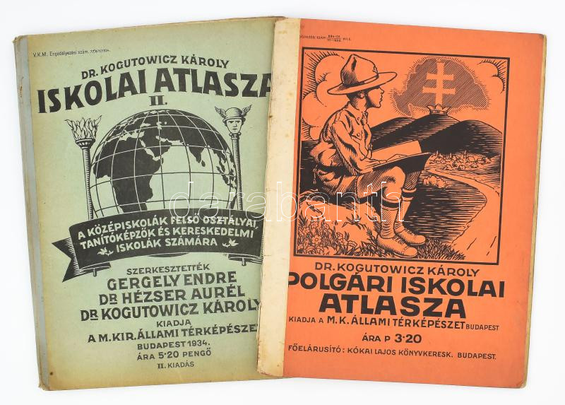 1930-1934 Dr. Kogutowicz Károly polgári iskolai atlasza + Dr. Kogutowicz Károly iskolai atlasza II. Bp., M. Kir. Állami Térképészet, 32 p., 56 p. Kissé sérült, az egyik javított gerinccel.