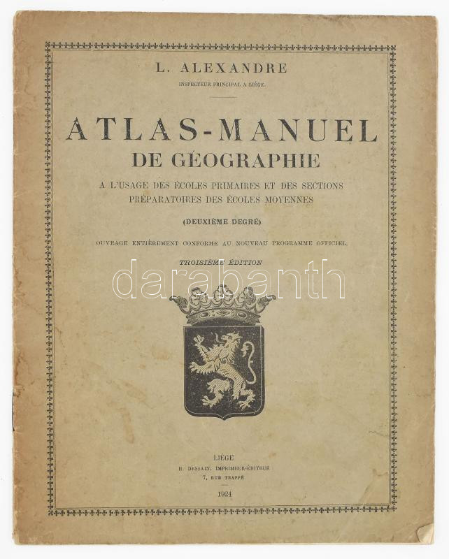 L. Alexandre: Atlas-manuel de geographie a l'usage des écoles primaires et des sections préparatoires des écoles moyennes. Liége, 1924., H. Dessain-ny., 24 p. + 5 t. Kiadói papírkötés.