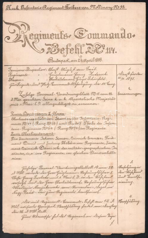 1898-1908 K.u.k. Infanterie Regiment Freiherr von Mollinary No. 38. ka... https://www.darabanth.com/de/477-Fernauktion/477.0/Kunst-Dokumente-andere-Sammelgebiete/Militaria~2000009/1898-1908-Kuk-Infanterie-Regiment-Freiherr-von-Mollinary-No-38-katonai-parancs-napi-parancs~II3251488