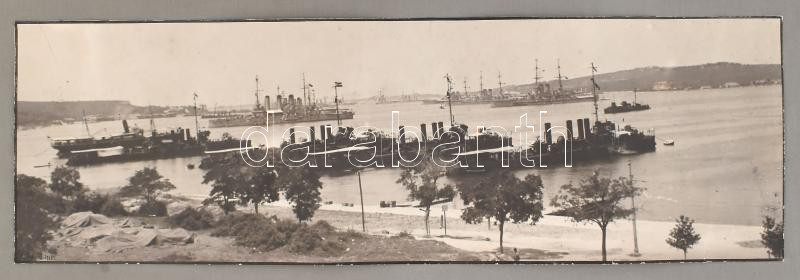 Beschreibung: 1915 A K.u.k. hadihajóhad a polai kikötőben, kartonra kasírozott egyedi fotó tussal szignálva (Ollinger), karton restaurált, 36,5×11,5 cm