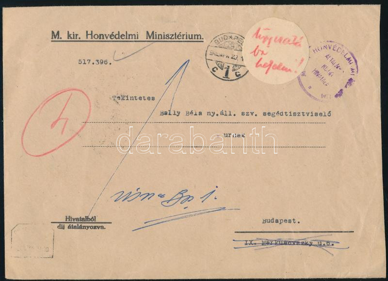 1940 M. Kir. Honvédelmi Minisztérium fejléces levélboríték Bally Béla ... https://www.darabanth.com/de/477-Fernauktion/477.0/Kunst-Dokumente-andere-Sammelgebiete/Militaria~2000009/1940-M-Kir-Honvedelmi-Miniszterium-fejleces-levelboritek-Bally-Bela-ny-all-szv-segedti~II3218001