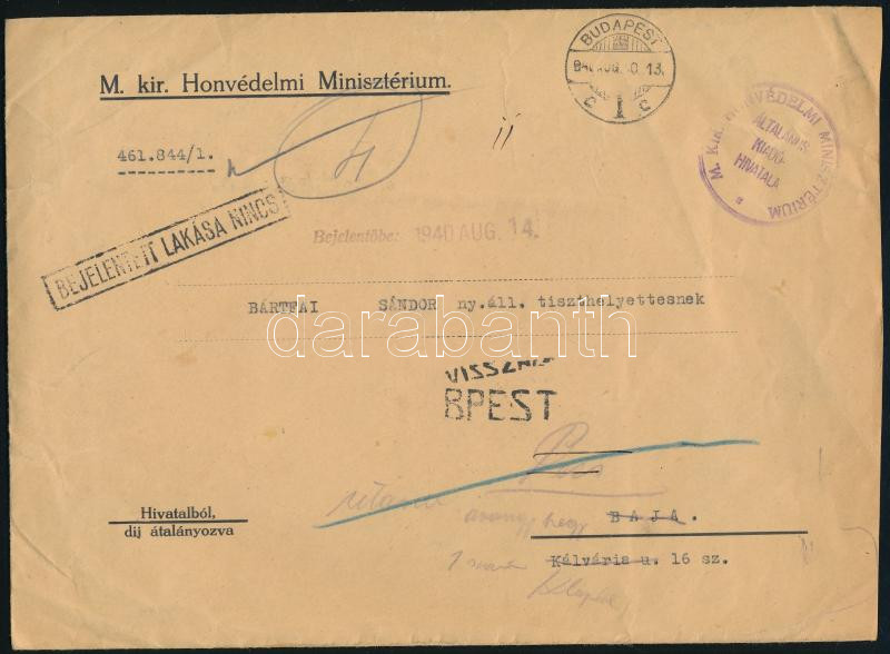 1940 M. Kir. Honvédelmi Minisztérium fejléces levélboríték Bártfai Sándor ny. áll. tiszthelyettesnek címezve, "Bejelentett lakása nincs" bélyegzéssel visszaküldve, tartalommal