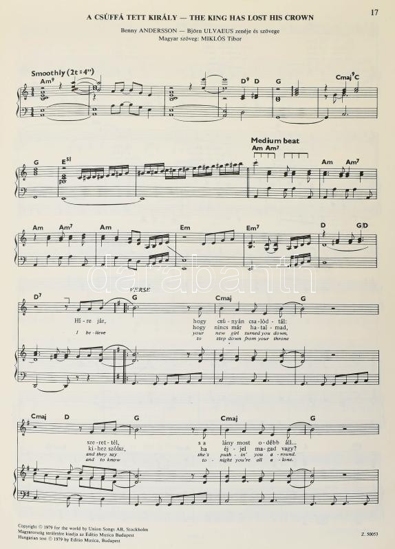 Beschreibung: Abba album 2. Énekhangra, zongorakísérettel. Bp., 1979, Zeneműkiadó, 44 p. Kiadói tűzött papírkötés, kopott borítóval, a hátsó borítón hajtásnyommal, foltos lapokkal.