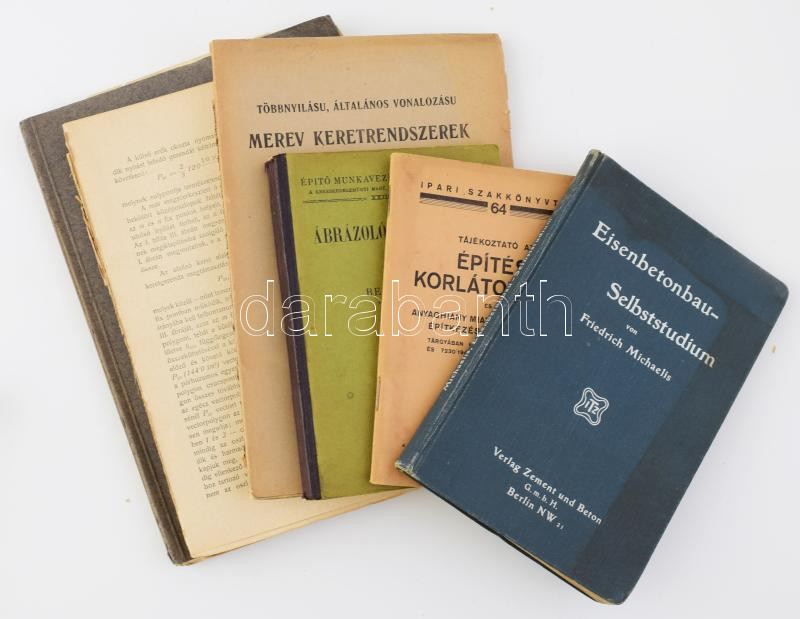 Építészeti, technikai témájú könyv és kiadvány tétel: Benda Jenő: Ábrázoló geometria. Építő Munkavezetők Könyvtára XXIII-XXV. Bp., 1910, Ifj. Nagel Ottó. Kiadói félvászon-kötés, jó állapotban. + Enyedi Béla: Többnyilásu, általános vonalozásu merev keretrendszerek grafikus szilárdsági vizsgálata. Bp., 1919, Németh József. Kiadói papírkötés, sérült, szétváló fűzéssel, a könyvtest két részre vált, felvágatlan lapokkal. + Palotai Ármin: A vizvezeték-szerelő. Műszaki Könyvtár IV. Bp., 1920, Népszava. Kiadói papírkötés, hiányzó borítóval. + Tájékoztató az építési korlátozások és az anyaghiány miatt félbenszakadt építkezések befejezése tárgyában kiadott 7240/1941. M. E. és 7230/1941. M. E. rendeletekről. Ipari Szakkönyvtár 64. (Bp., 1942), Ipari Tanfolyamok Országos Vezetősége. Kiadói tűzött papírkötés. + Michaelis, Friedrich: Eisenbetonbau - Selbststudium. Berlin, 1910, Verlag Zement und Beton G.m.b.H., 108 p. Német nyelven. Kiadói egészvászon-kötés, kissé kopott, foltos borítóval. + cca 1918-1921 Ulrich B. J. Budapest lefolyó- és gázcső, kazán és egyéb berendezés árjegyzékek, vegyesen, nem saját papírborítóban