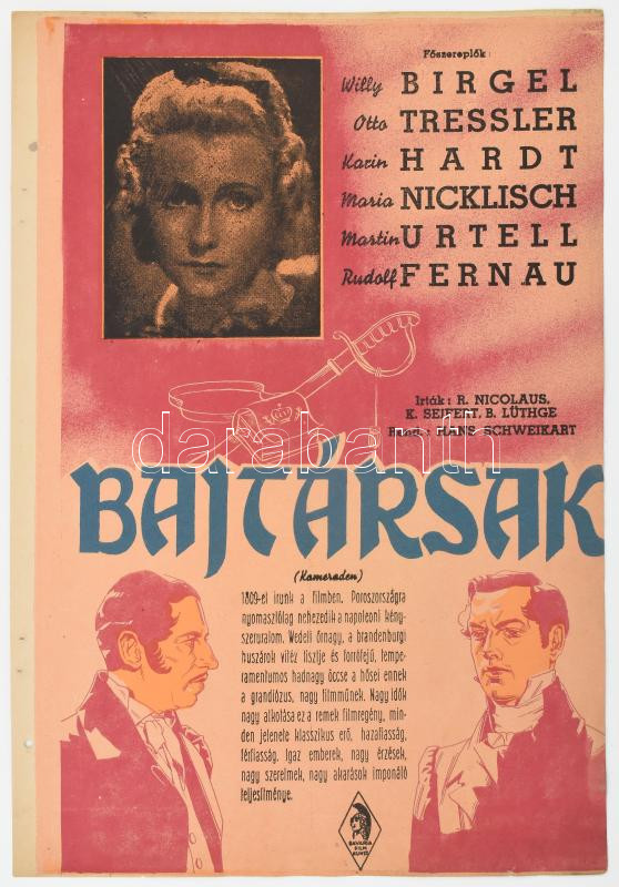 1943 Hans Schweikart Bajtársak című filmjének plakátja, kis folttal, s... https://www.darabanth.com/de/477-Fernauktion/477.0/Kunst-Dokumente-andere-Sammelgebiete/Plakat~2000014/1943-Hans-Schweikart-Bajtarsak-cimu-filmjenek-plakatja-kis-folttal-sarokhajlassal-33-5x23-c~II3244855