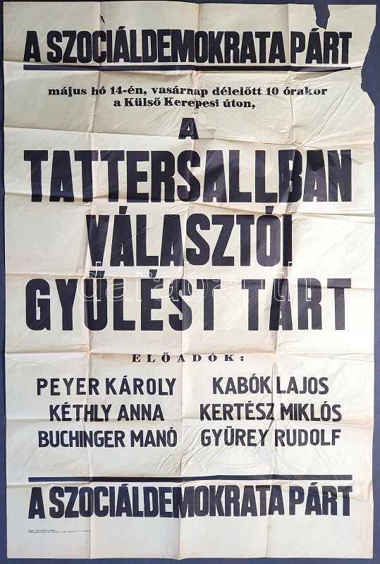 [Plakát] ,,A Szociáldemokrata Párt [1939.] május hó 14-én, vasárnap délelőtt 10 órakor a Külső Kerepesi úton, a Tattersallban választói gyűlést tart. Előadók: Peyer Károly, Kéthly Anna, Buchinger Manó, Kabók Lajos, Kertész Miklós, Gyürey Rudolf". A Szociáldemokrata Párt hirdetése az 1939. évi országgyűlési választások idején. (1939) Budapest, 1939. Világosság Rt. ny. Választási hirdetés, mérete: 945x625 mm. A hazai gyári munkavállalói réteget képviselő Magyarországi Szociáldemokrata Párt sorsa viharosan alakult a Tanácsköztársaság ideje alatt és után. A kommunistákkal való egyesülés ellen az MSZDP számos vezetője tiltakozott, sokuk el is hagyta az országot. Vezetőik másik részét pedig a Tanácsköztársaság bukása utáni átmeneti kormány ítélte száműzetésre. Az 1919-1920-as időszak ügyvezető kormányai ugyan jog szerint nem tiltották be az MSZDP-t, ám tagjaik és vezetőik módszeres ellehetetlenítése folytatódott. Tiltakozásképpen az MSZDP a Horthy-korszak első parlamenti választását bojkottálta. Az 1920 végén kormányra kerülő Bethlen István miniszterelnök a belpolitikai helyzet konszolidálására törekedett, így a rendszer erős ellenzékének számító szociáldemokraták vezetőjével 1921 decemberében egyezséget kötött (Bethlen-Peyer-paktum). Ennek jegyében a következő országgyűlési és törvényhatósági városi választásokon a MSZDP már indulhatott, választási és társadalmi programját bizonyos korlátozásokkal, de terjeszthette. Az MSZDP a következő választásokon (1922, 1926, 1931, 1935) - a választójogi korlátozásokat figyelembe véve - tűrhetően szerepelt, és 25, 14, 14 és 11 képviselőt küldhetett az országgyűlésbe, a budapesti törvényhatósági választásokon pedig jól szerepelt, és ez csökkentő tendenciával, de a német megszállásig (1944) így is maradt. 1935 után azonban több figyelemreméltó változás állt be a politikában. Az Anschluss után a Harmadik Birodalom Magyarország közvetlen közelébe került, a szomszédsággal pedig a korábban is már marginálisan létező, ám külföldről is pénzelt magyar nemzetiszocialista ideológia megerősödött. A régóta hatalomban levő kormánypárt minden erőt megragadott az új erőnek minősülő nyilas pártok korlátozására, lapjait betiltotta, gyülekezéseit korlátozta, vezetőit bebörtönözte, ám saját kormányhatalma megtartása érdekében 1938-ban a választójogi szabályokat ismételten megváltoztatta. A kormány továbbra sem volt érdekelt az általános választójog érvényesítésében, ám a vidéki körzetekben korábban általánosan használt nyílt voksolás rendszerét eltörölte, a szavazás tehát az 1939. évi választásokon alapult először általánosan - azaz városi és vidéki körzetekben egyaránt - titkos voksoláson. A törvény továbbá előírta, hogy nagyobb városokban csak listákra lehet szavazni, míg a vidéki körzetekben - a kormánypárt hagyományos bázisán - listákra és egyéni képviselőkre egyaránt, ez az új rendszer - mely a nyílt szavazás eltörléséért cserébe kétszeres szavazatot adott a kormánypárt vidéki bázisának - értelemszerűen a kormánypárt győzelmére szolgált, azon szándék mellett, hogy a nagyvárosi tömegek nyilas szavazatait a marginalitásban tartsa. Az elsősorban a nyilas ellenzéket erodálni kívánó terv felemás módon sikerült, a szociáldemokrata és a liberális ellenzék igen szerény eredményt ért el, a nyilasok eredményeit érdemben kevésbé befolyásolta. Plakátunk az 1939. május 25-26-ra kitűzött országgyűlési választások kampányküzdelmeibe avat be. A szociáldemokrata párt a kampány hónapjaiban markáns kampánymunkát végzett, az utolsó hónapban a Népszava beszámolói szerint nem volt ritka egyes választókörzetekben a naponta több választói gyűlés szervezése sem. Dokumentumunk egy nagyszabású választási gyűlést hirdet meg az MSZDP vezérszónokaival, Peyer Károllyal, Kéthly Annával, Buchinger Manóval, az országgyűlés neves és országszerte ismert szónokaival. A Tattersall, azaz a Pesti Ügető rendezvényhelyszíne tágas színhelynek ígérkezett, és lefoglalása jelentős eredménynek számított egy olyan helyzetben, ahol a szociáldemokrata párt a fővárosi kampányhelyszínek lefoglalásában jelentős versenyt futott a kormánypárttal, illetve a nyilas szervezetekkel. Különféle ügymeneti problémákra hivatkozva azonban az Ügető ügyvezetője néhány nappal a rendezvény előtt lemondta a megrendelést, a helyszínen végül egy kisebb pártrivális, a keresztényszocialista EMSZO tarthatott nagygyűlést. A Népszava egykori beszámolója szerint a Szociáldemokrata Párt érthető módon zokon vette az eljárást, ezt is el kellett könyvelnie a pártot ért politikai zaklatások (esetlegesen összeesküvések) egyikének. Jóllehet a Szociáldemokrata Párt nagy erővel vetette be magát a választási küzdelmekbe, de a főváros és néhány nagyváros gyári munkásságának választási bázisát érdemben nem bővítette. Az 1939 májusi választáson a 3,686 603 beérkezett szavazat 50%-a a kormánypárté lett, 14%-a nyilaskeresztes párté, a kisgazdapárt 15%-ot, a szociáldemokrata párt 3,42%-ot teljesített. A kormánypárt 181 mandátuma mellett 29 nyilas, 14 kisgazda, 5 szociáldemokrata és 5 liberális képviselő került az országgyűlésbe. Plakátunk jobb felső sarkában kisebb, a szövegtükröt nem érintő hiányok, bal oldalt, felül apró hiány. Jó állapotú plakát, hajtogatva.