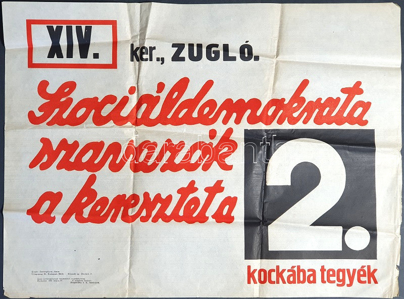 [Plakát] ,,Szociáldemokrata szavazók a keresztet a 2. kockába tegyék". A Szociáldemokrata Párt zuglói szervezetének felhívása az 1935. évi budapesti törvényhatósági (önkormányzati) választások idején. (1935) Budapest, 1933. Világosság Rt. ny. Kétszínnyomású választási hirdetés, mérete: 460x630 mm. A Magyarországi Szociáldemokrata Párt sorsa viharosan alakult a Tanácsköztársaság ideje alatt és után, a kommunistákkal való egyesülés ellen az MSZDP számos vezetője tiltakozott, sokuk el is hagyta az országot. Vezetőik másik részét pedig a Tanácsköztársaság bukása utáni átmeneti kormány ítélte száműzetésre. Az 1919-1920-as időszak ügyvezető kormányai ugyan jog szerint nem tiltották be az MSZDP-t, ám tagjaik és vezetőik módszeres ellehetetlenítése folytatódott. Tiltakozásképpen az MSZDP a Horthy-korszak első parlamenti választását bojkottálta. Az 1920 végi választással kormányra kerülő Bethlen István miniszterelnök a belpolitikai helyzet konszolidálására törekedett, így a rendszer erős ellenzékének számító szociáldemokraták vezetőjével 1921 decemberében egyezséget kötött (Bethlen-Peyer-paktum). Ennek jegyében a következő országgyűlési és törvényhatósági (önkormányzati) választásokon a MSZDP már indulhatott, választási és társadalmi programját bizonyos korlátozásokkal, de terjeszthette. Az MSZDP a következő országgyűlési és önkormányzati választásokon (1922, 1926, 1931, 1935) - a választójogi korlátozásokat figyelembe véve - tűrhetően szerepelt, és 25, 14, 14, illetve 11 képviselőt küldhetett az országgyűlésbe, a budapesti törvényhatósági választásokon pedig jól szerepelt, és ez csökkentő tendenciával, de a német megszállásig (1944) így is maradt. Az 1935. évben három választásra is sor került, március végén a kormánypártot szokás szerint megerősítő országgyűlési választásokra, április folyamán az OTI-választásokra (az országos társadalombiztosítási szerv vezetésébe választással paritásos alapon kerültek be munkaadói és munkavállalói pártképviselők), 1935. június 2-3-án pedig a budapesti törvényhatósági választásokra. A Szociáldemokrata Párt a megelőző törvényhatósági szavazáson igen tisztesen szerepelt - a legtöbb szavazatot gyűjtötte be. Az önkormányzati választások tétje nem volt éppen csekély, hiszen a főváros nehezen létesített szociális intézményeinek működési feltételeiről, a budapesti gáz- és villanyárról, a HÉV- és BESZKÁRT-jegyek áráról a korszakban fővárosi szinten döntöttek, és a Népszava feltételezése szerint a fővárosban szokásos titkos szavazás intézményének megmaradása is a választás tétje volt. A húsba vágó kérdésekről döntő törvényhatósági választás így érthetően komoly lázban tartotta a főváros választóit, május hónap során naponta több kampányeseményre került sor minden kerületben, a mozgósításban a szociáldemokraták kiváltképpen jól szerepeltek. Természetesen ez a választási időszak sem volt mentes a botrányoktól, ajánlócédulákkal való visszaélésekről, halott szavazók névjegyzékbe való felvételéről, szervezett megtévesztésekről is születtek híradások. Az előkészületi időszak eredménye az ajánlócédulák összegyűjtése volt, a szociáldemokrata párt ennek nyomán a főváros 11 kerületében állíthatott listát. Plakátunk kimondottan a XIV. kerületi (zuglói) szociáldemokrata szimpatizánsok számára készült; minden kerületben más volt a párt sorsolással meghatározott sorrendje a szavazólapon: Zuglóban az MSZDP pártlistája a 2. helyre került. A két napig tartó választáson végül a főváros 292.737 választásra jogosult szavazójából 209.140-en leadták voksukat. A legtöbb szavazatot a kormánypárt (Nemzeti Egység Pártja) gyűjtötte be, a szavazatok 25%-ával, a második helyen a Szociáldemokrata Párt végzett, a munkavállalói párt a szavaztok 23.3%-át kapta (48.655 szavazattal). Plakátunk szélén apró gyűrődések. Jó állapotú plakát, hajtogatva.