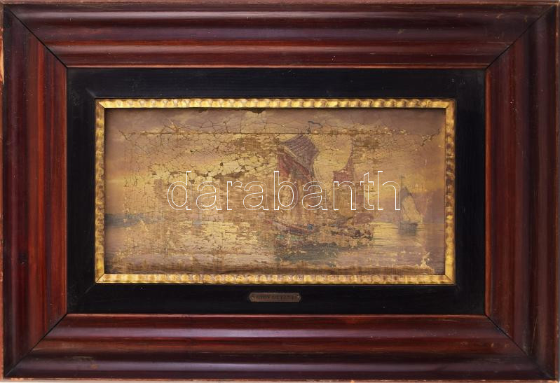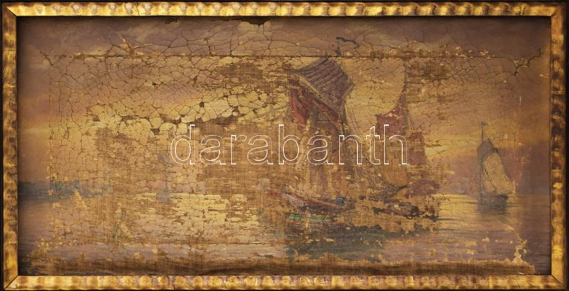 Dekoratív, régi fakeret vitorlásokat ábrázoló, jelzés nélküli olaj-vászon, festménnyel, festmény erősen sérült, vakrámán és kissé kopott kereten Giov. Ottini feliratú fém táblával, belső méret: 40,5x66,5 cm