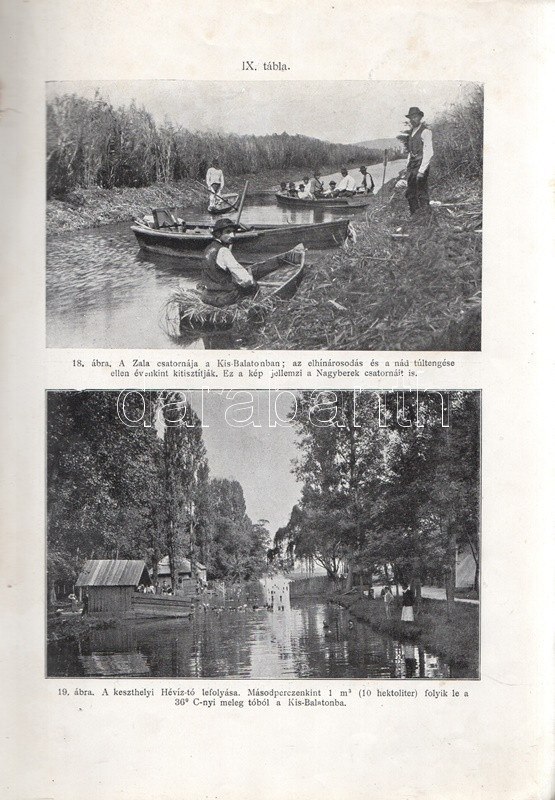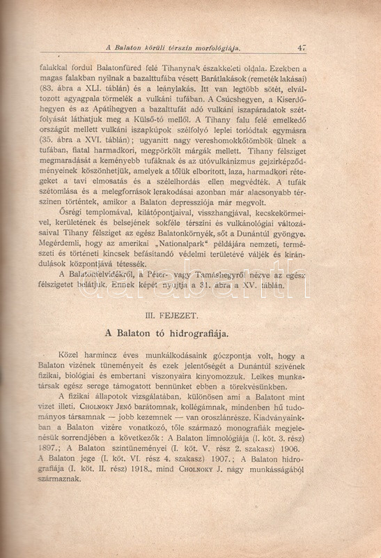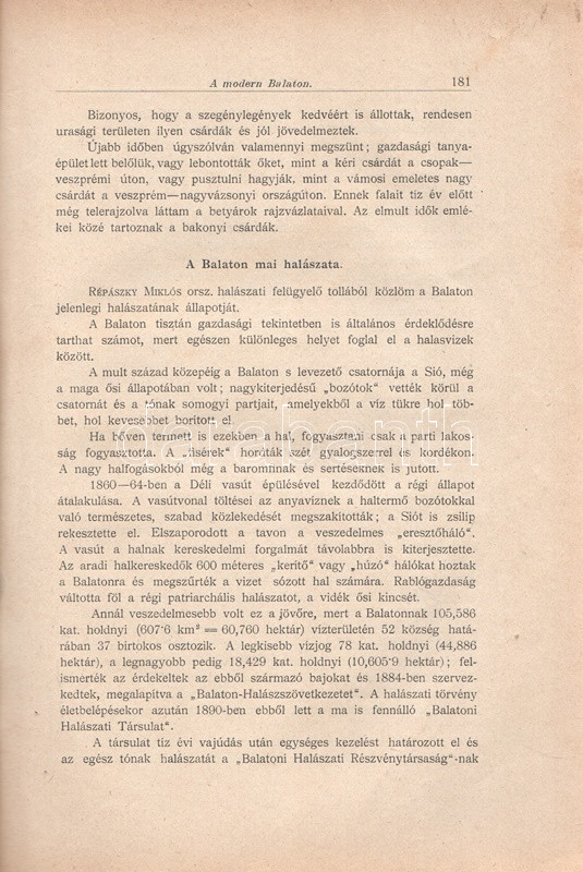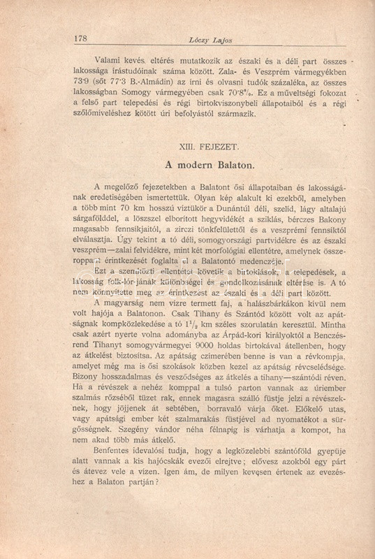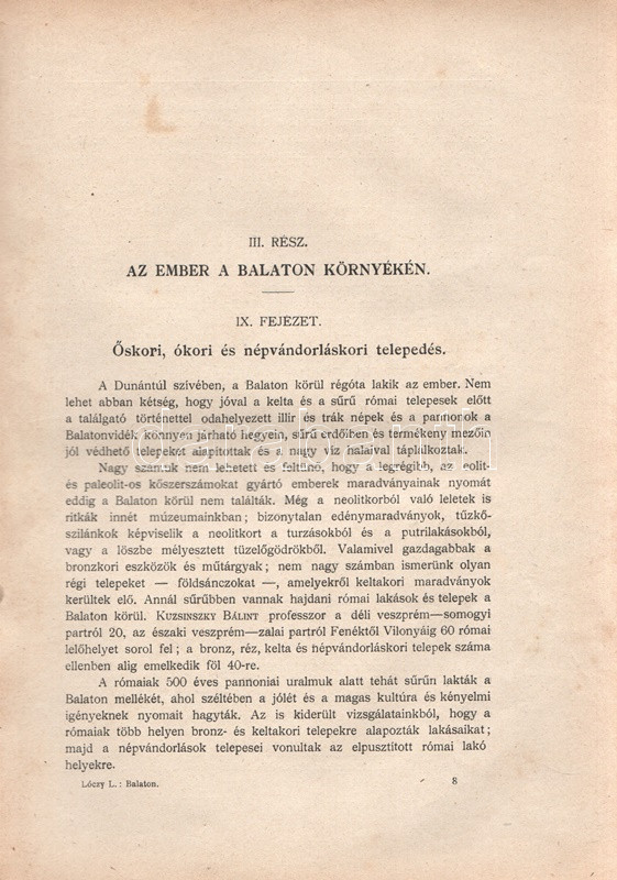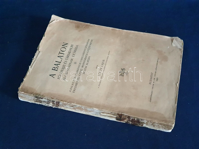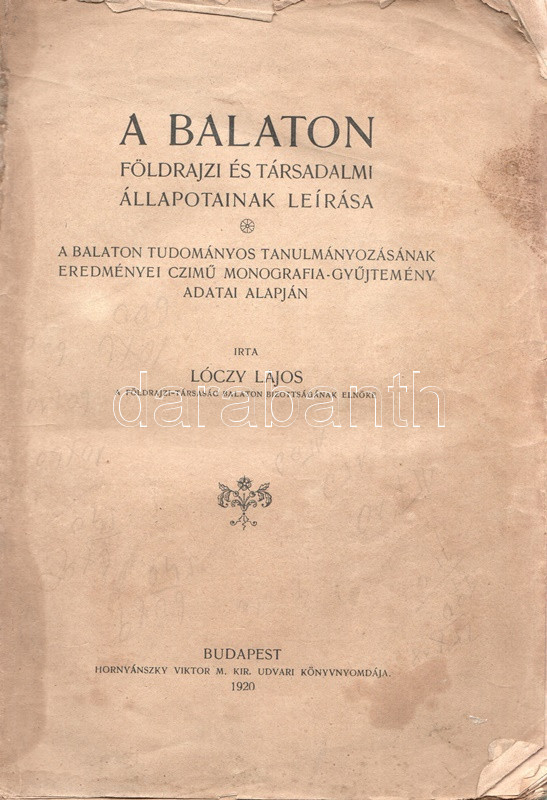 Lóczy Lajos: A Balaton földrajzi és társadalmi állapotainak leírása. A Balaton tudományos tanulmányozásának eredményei czímű monografia-gyűjtemény adatai alapján. Budapest, 1920. Hornyánszky Viktor ny. 194 p. + 27 t. (egy színes, 25 kétoldalas). Egyetlen kiadás. Az előszó tájékoztatása szerint a Balaton tudományos kutatása 1891-ben, a balatoni rendszeres gőzhajózás és így a balatoni turizmus fellendülésének évtizedében. A tudományos kutatás megindulása a visszaemlékezés egy konkrét eseményhez köthető: a Balaton 1891. évi rekord alacsonyságú vízállása aggasztó mértékű hínárosodáshoz vezetett, ezt elhárítandó pedig egy komolyabb tudóscsoportot állítottak fel. Az 1891. évi kezdetek óta a Balaton-kutatás eredményeinek egész monográfia-sorozatot szenteltek. Kiadványunk az azóta összegyűjtött anyagok nyomán ad közre rövidebb tanulmányokat. A kötet elején geológiai és hidrológiai tanulmányok, később a tágabban értelmezett társadalomföldrajz fogalomkörébe tartozó cikkek, többek között a balatoni halászatról, ősfoglalkozásokról, a környék népi építészetéről, néprajzáról, antropológiájáról, népszokásairól. Tizenöt levél felső sarkán kisebb hiány, néhány tábla szélén apró szakadásnyom, egy táblán kézi számítás. BOEH VI: 6909. Fűzve, borító nélkül, hiányos, enyhén sérült gerinccel, az enyhén foltos címoldalon és az utolsó levélen apró sérülések és kézi számítások. Körülvágatlan példány.