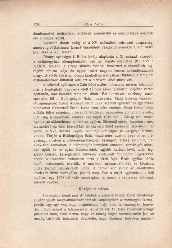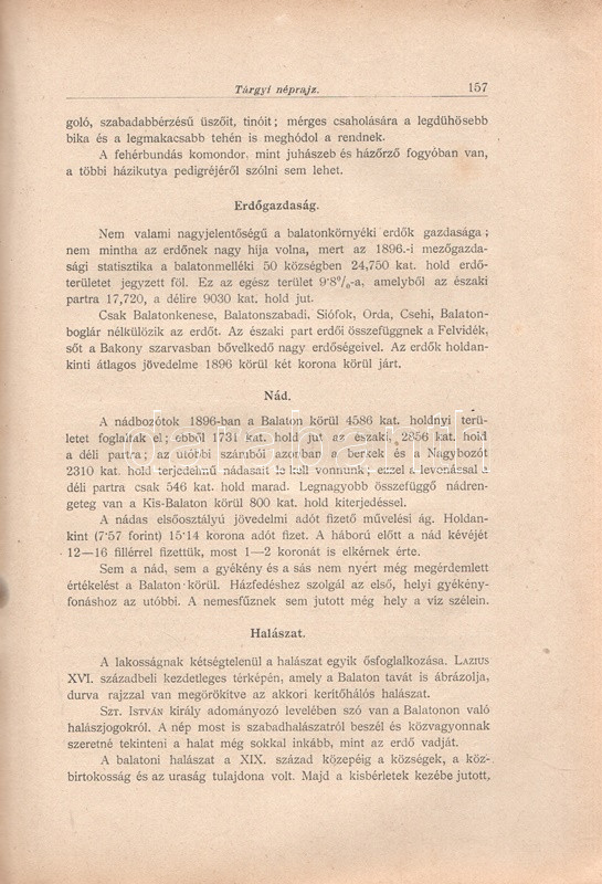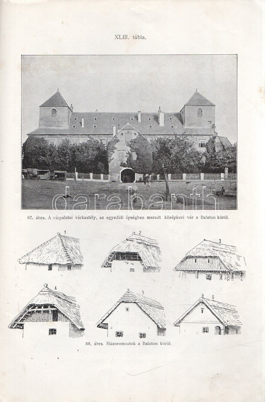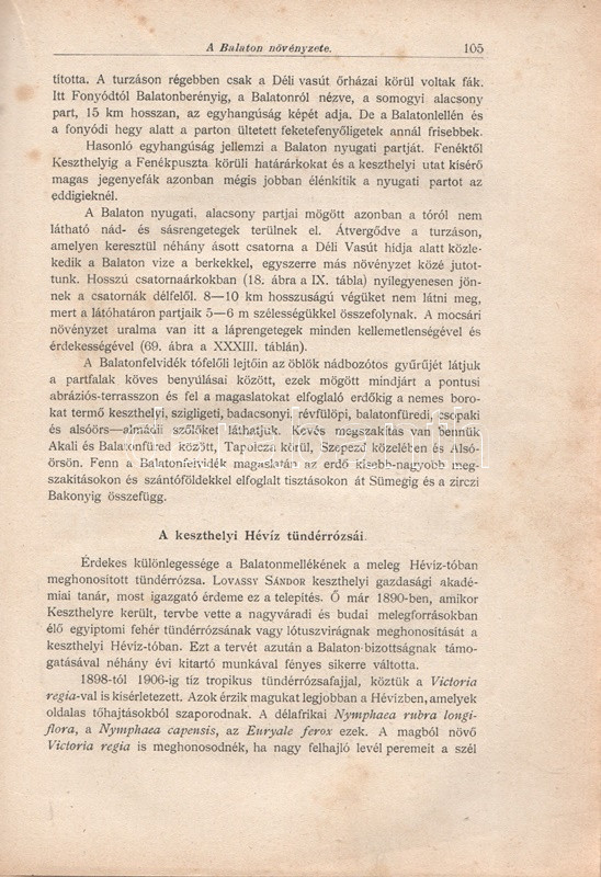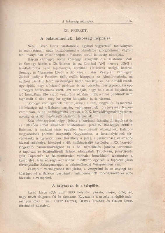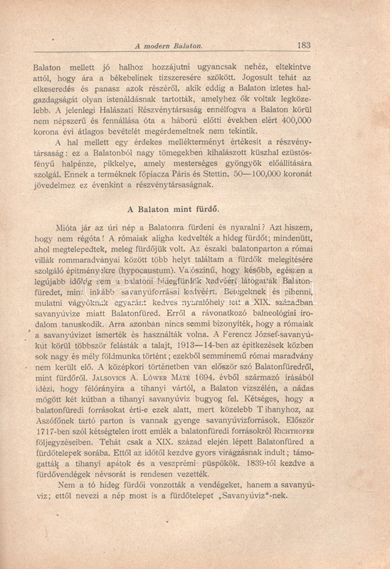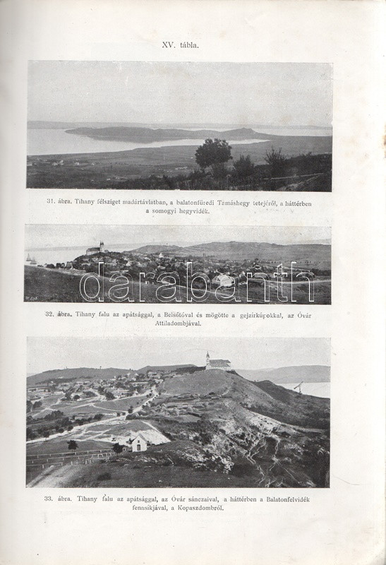 Lóczy Lajos: A Balaton földrajzi és társadalmi állapotainak leírása. A Balaton tudományos tanulmányozásának eredményei czímű monografia-gyűjtemény adatai alapján. Budapest, 1920. Hornyánszky Viktor ny. 194 p. + 27 t. (egy színes, 25 kétoldalas). Egyetlen kiadás. Az előszó tájékoztatása szerint a Balaton tudományos kutatása 1891-ben, a balatoni rendszeres gőzhajózás és így a balatoni turizmus fellendülésének évtizedében. A tudományos kutatás megindulása a visszaemlékezés egy konkrét eseményhez köthető: a Balaton 1891. évi rekord alacsonyságú vízállása aggasztó mértékű hínárosodáshoz vezetett, ezt elhárítandó pedig egy komolyabb tudóscsoportot állítottak fel. Az 1891. évi kezdetek óta a Balaton-kutatás eredményeinek egész monográfia-sorozatot szenteltek. Kiadványunk az azóta összegyűjtött anyagok nyomán ad közre rövidebb tanulmányokat. A kötet elején geológiai és hidrológiai tanulmányok, később a tágabban értelmezett társadalomföldrajz fogalomkörébe tartozó cikkek, többek között a balatoni halászatról, ősfoglalkozásokról, a környék népi építészetéről, néprajzáról, antropológiájáról, népszokásairól. Tizenöt levél felső sarkán kisebb hiány, néhány tábla szélén apró szakadásnyom, egy táblán kézi számítás. BOEH VI: 6909. Fűzve, borító nélkül, hiányos, enyhén sérült gerinccel, az enyhén foltos címoldalon és az utolsó levélen apró sérülések és kézi számítások. Körülvágatlan példány.