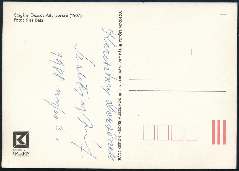 Beschreibung: 1988 Szalatnyay József, Klauszer (1915-1994) festő, grafikus autográf aláírása és dedikációja Keresztury Dezső részére, Czigány Dezső Ady-portréját reprodukáló képeslapon